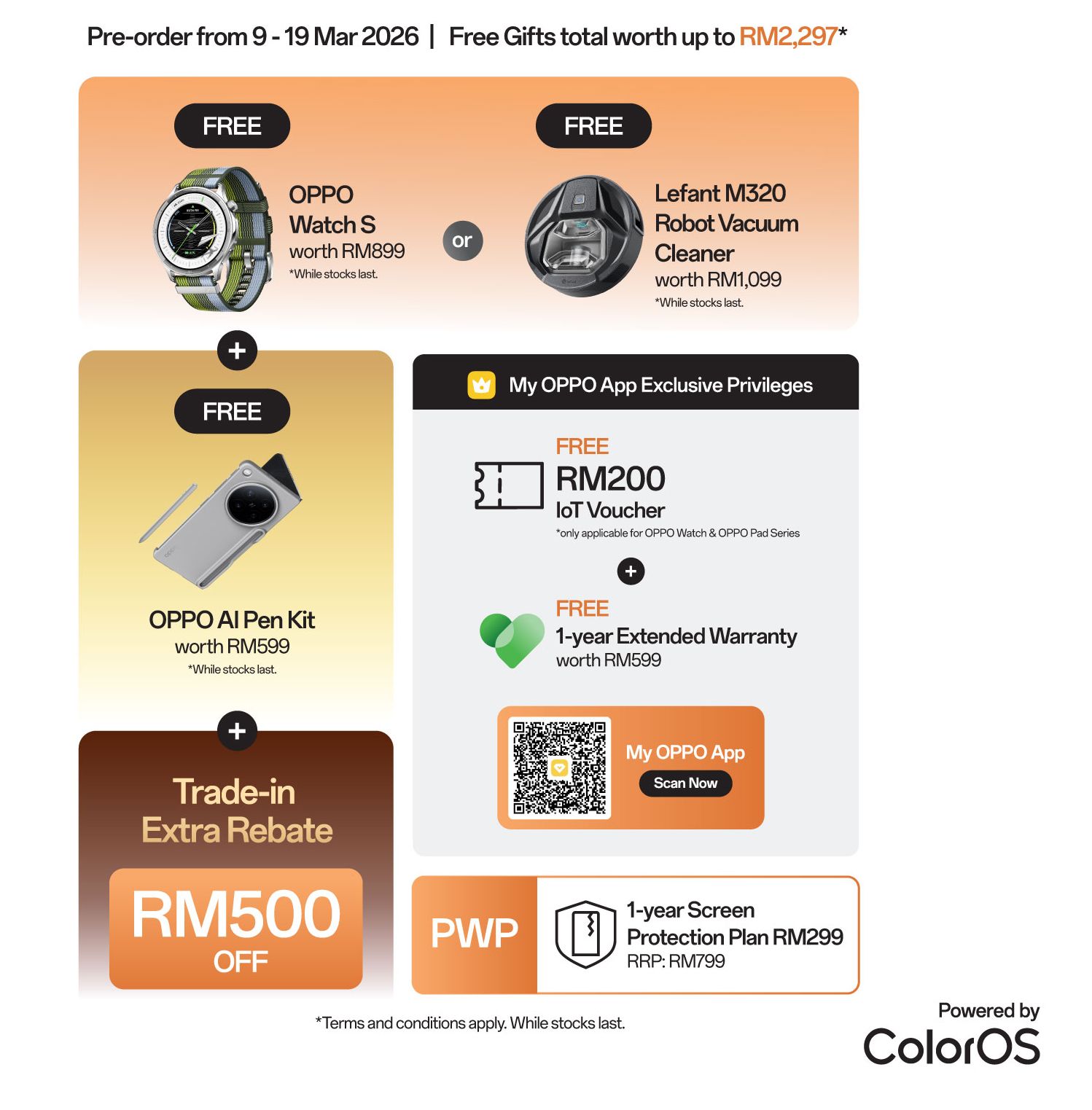 赠品包括可在OppoWatchS(价值899令吉)或LefantM320扫地机器人(价值1099令吉)之间二选一。此外,OppoMalaysia还提供免费的OppoAIPenKit(价值599令吉),以及最高500令吉的以旧换新额外回扣优惠。
