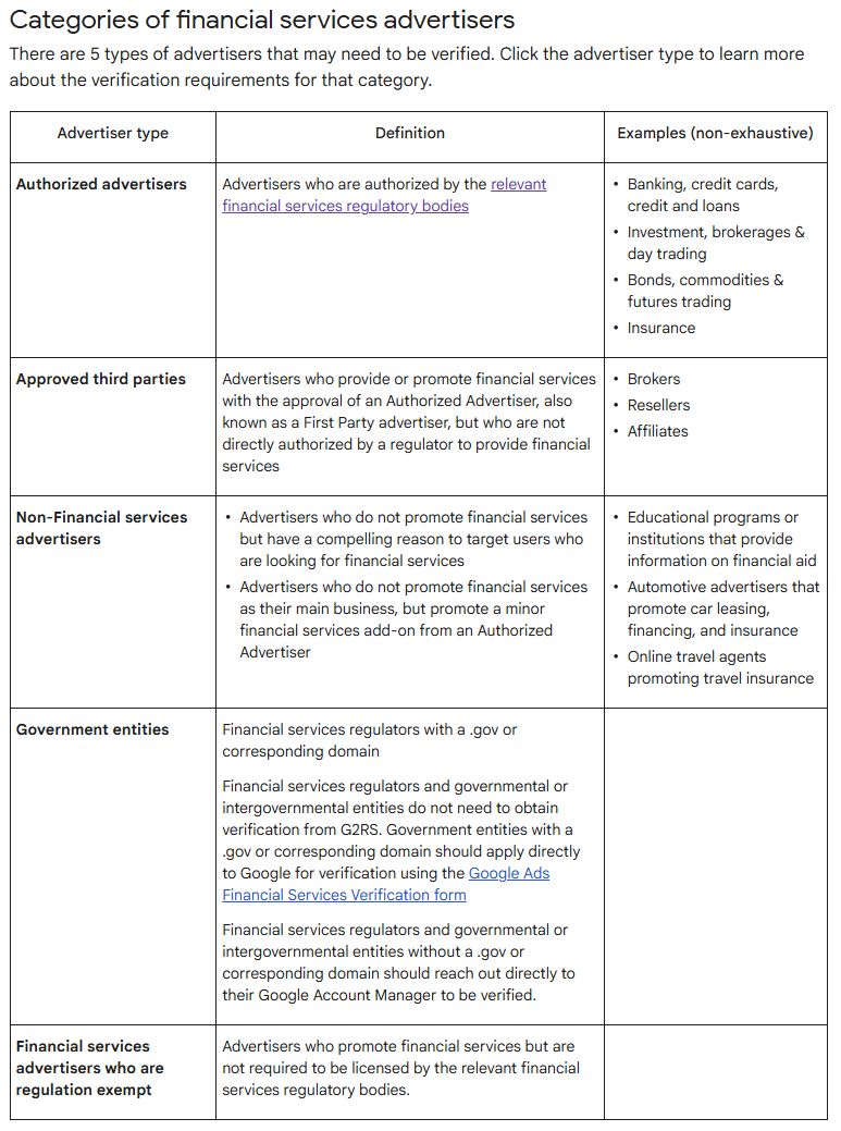大多数金融服务广告商必须首先通过G2 Risk Solutions完成第三方验证,以确认该企业是否获得相关金融监管机构的授权。验证通过后,广告商将收到一个唯一代码(unique code),必须将其提交给谷歌以完成金融服务验证流程。