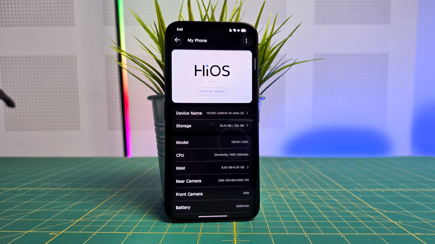 Camon 50 Ultra配备了一块6500mAh的电池,支持45W USB-C快充。该机出厂预装基于Android 15的HiOS 16系统,Tecno承诺为用户提供长达三年的Android系统重大更新和五年的安全补丁支持。