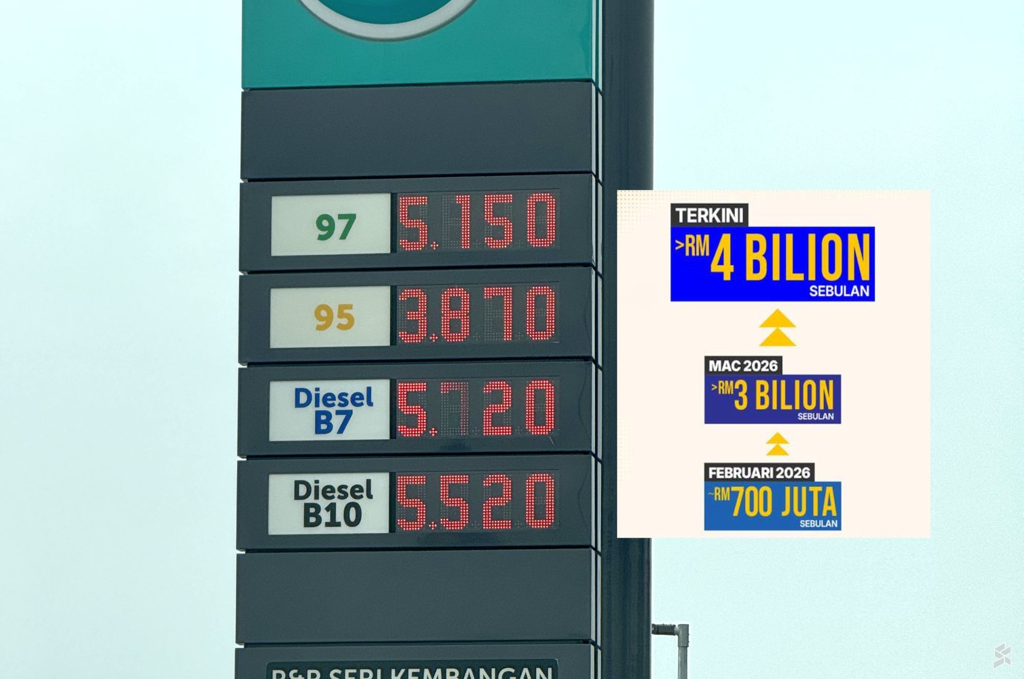 由于当前中东危机导致全球油价上涨,政府为了维持每公升1.99令吉的补贴价格,不得不大幅增加支出。仅2月份,补贴支出就高达约7亿令吉。3月份,这一数字飙升至约30亿令吉,预计4月份将超过40亿令吉。