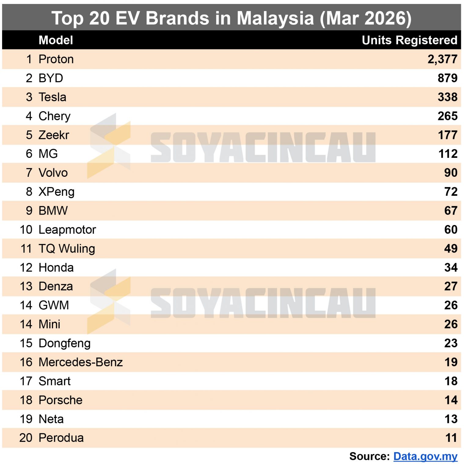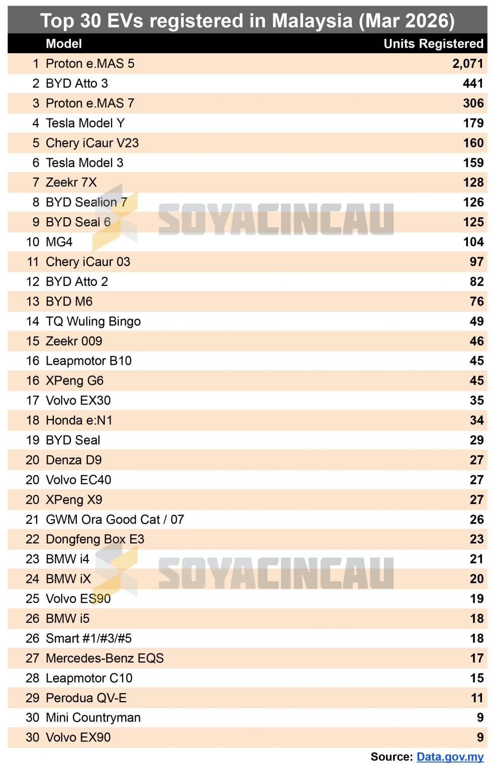2026年3月,Proton e.MAS 5继续稳居马来西亚最畅销电动车,注册量达2071辆,领先幅度明显。