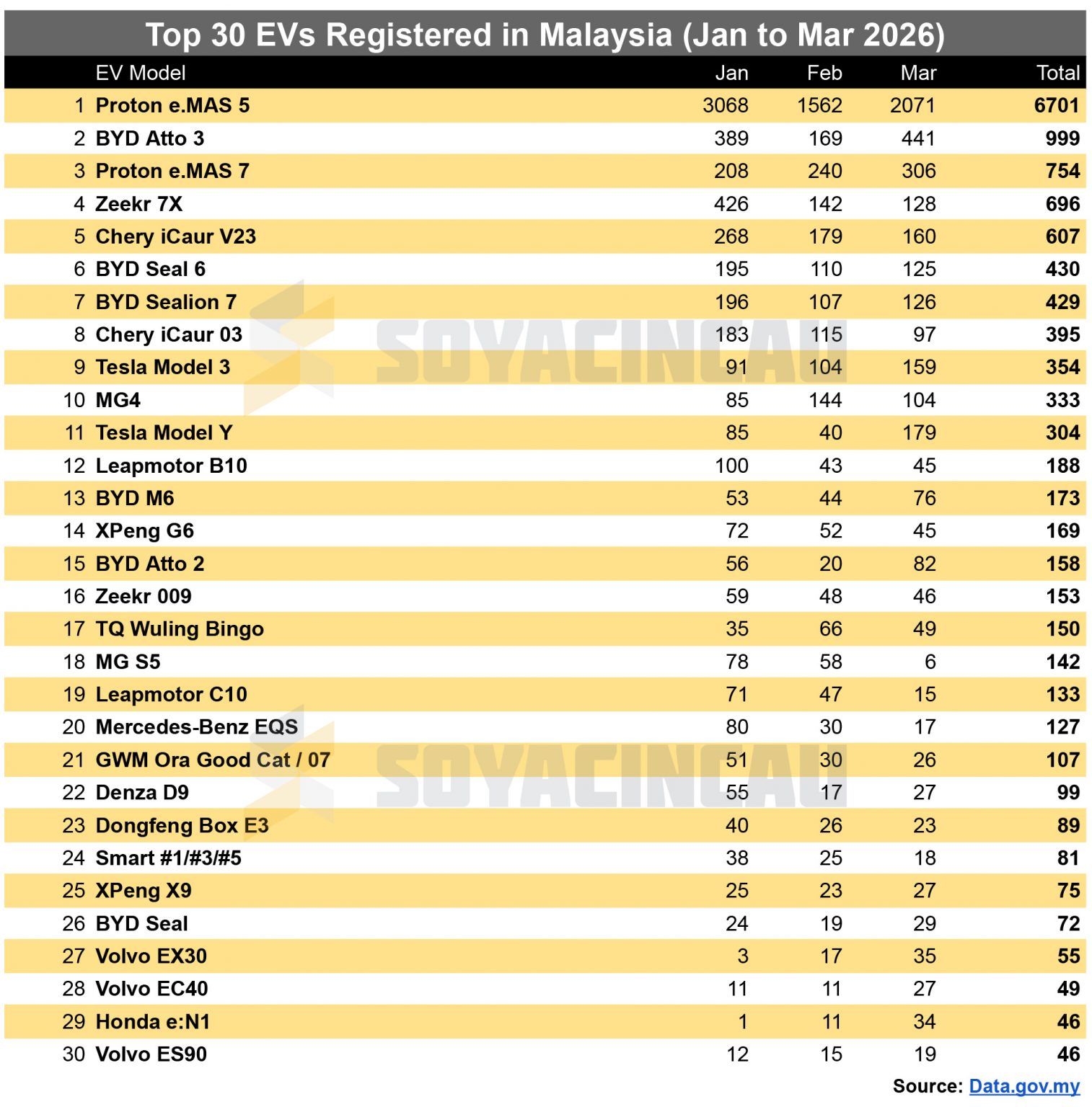 从2026年首季整体数据来看,Proton e.MAS 5以6701辆的巨大优势位居榜首。