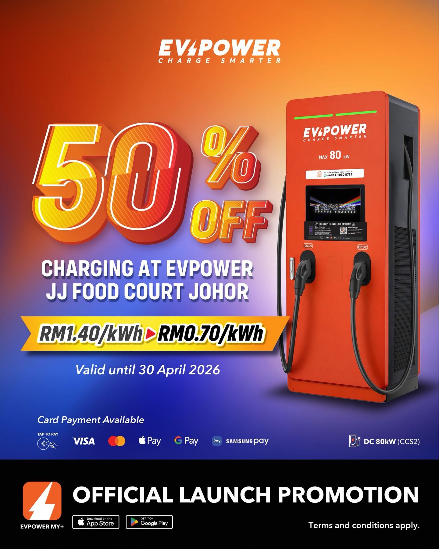 从周六(4月18日)至4月30日,EVPower在JJ Food Court提供电动车充电半价优惠。这意味着只需每千瓦时70仙,即可享受直流快充服务。