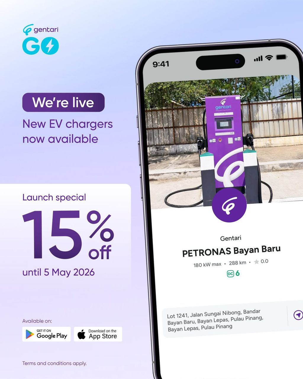 作为新充电站开业促销的一部分,电动车用户在Gentari Go App上激活充电桩之前,输入优惠码 GO15BB 即可享受15%的折扣。